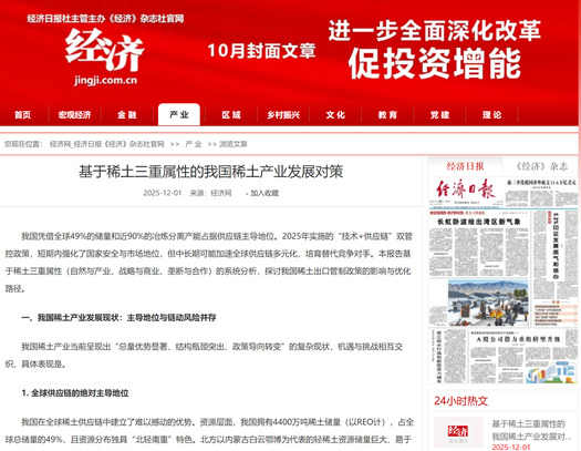 文章基于稀土三重属性(自然与产业、战略与商业、垄断与合作),探讨我国稀土出口管制政策的影响与优化路径。系统阐述了我国稀土产业发展现状、稀土资源基本属性以及我国稀土产业发展。文章强调,需构建三维平衡的政策体系,统筹安全与发展、垄断与合作,以巩固我国稀土产业短期优势并应对长期风险。(撰稿、供图:陈佩,审核:徐俊杰)
