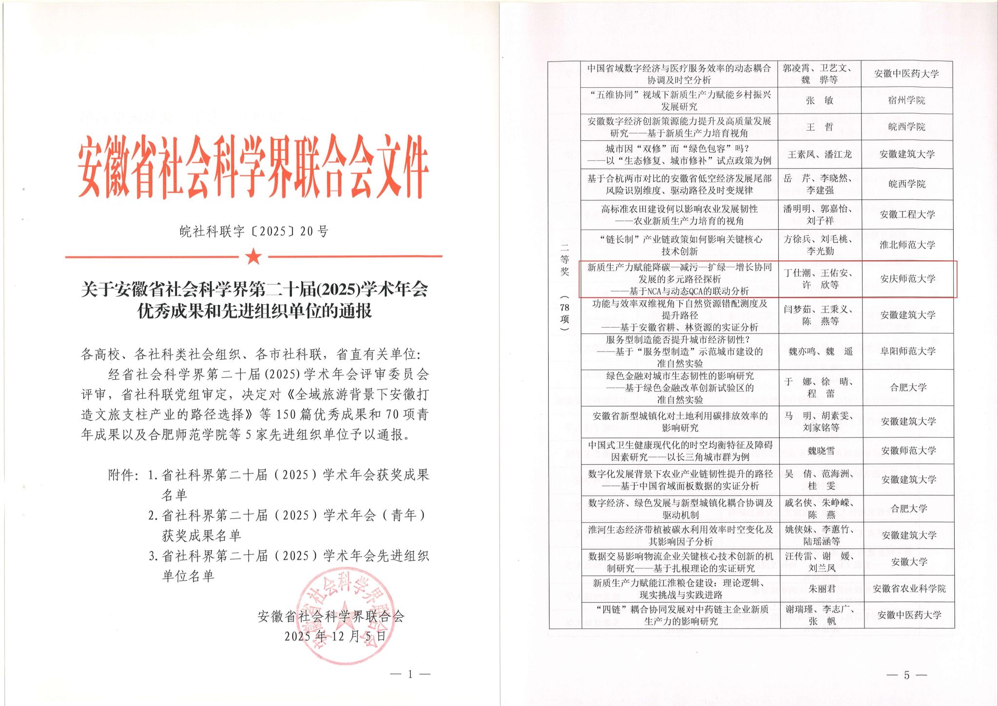 近日,安徽省社科联公布了第二十届(2025)学术年会获奖成果名单,我院丁仕潮副教授等撰写的论文《新质生产力赋能降碳—减污—扩绿—增长协同发展的多元路径探析——基于NCA与动态QCA的联动分析》在此次评审中获得二等奖。据悉,一、二等奖被省教育厅列为我省高校科研奖励项目,并列入高校教师专业技术资格科研奖励分类表,奖励等级为三类。(撰稿、供图:徐洋;审核:徐俊杰)
