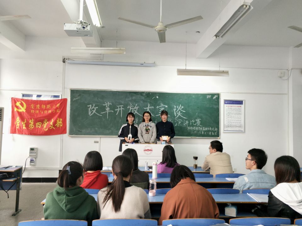 11月5日上午,365英国上市网站官网学生第四党支部、学生第七党支部在C505教室开展“改革开放大家谈”主题党日活动暨演讲比赛。学生第四党支部书记徐菲、学生第七党支部书记孙栎简、学生第八党支部书记贺卫,学生第四党支部、第七党支部全体党员参加此次活动。