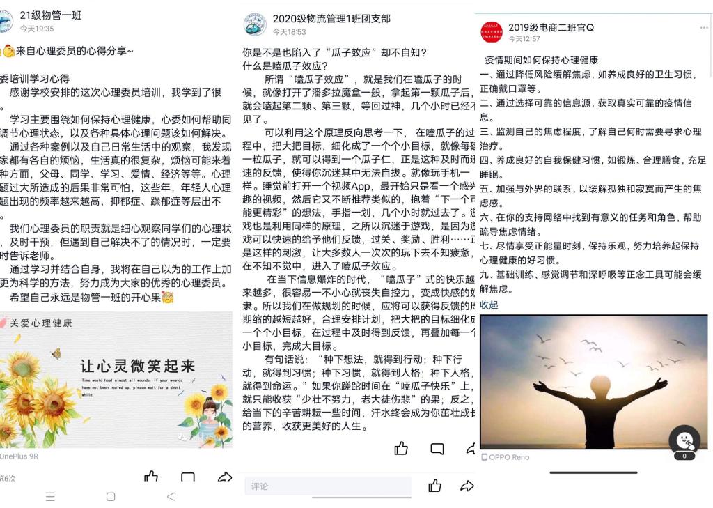 在本次培训中,各班心理委员就如何保持心理健康、调节心理状态以及各种具体心理问题的解决方法等内容进行学习。线上培训后,为进一步发挥心理委员的带头作用,更好地宣传心理健康知识,各班心理委员积极在班级官q进行心理知识宣传推广。如,2021级物流管理1班在官q中总结了本次学习的内容以及明确了心理委员的职责;2020级物流管理1班分析了“嗑瓜子效应”,激发了同学们培养健康心理的积极性;2019级电子商务2班通过官Q分享了疫情期间保持心理健康的方法。