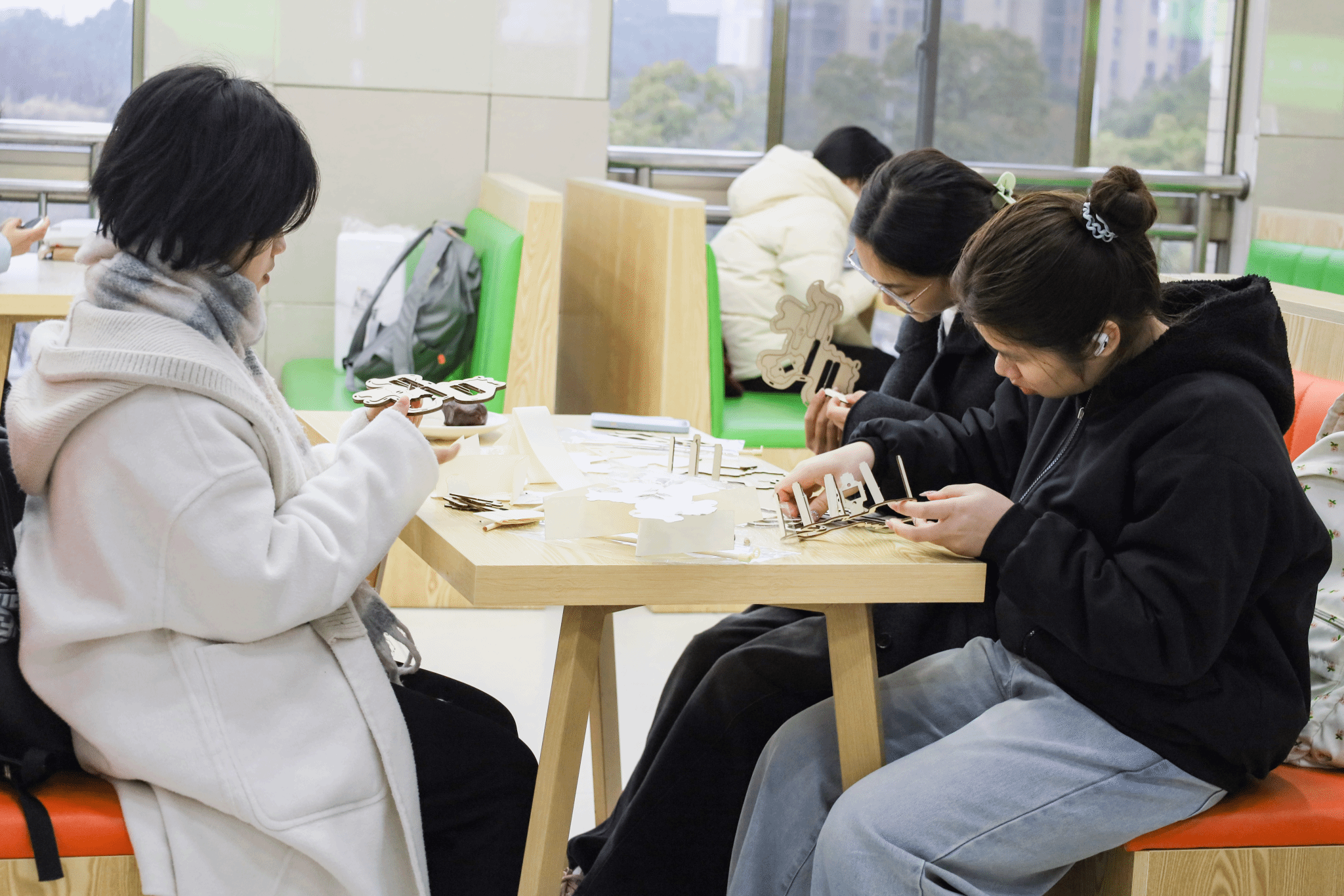 “哎哟,我的小木板‘跑’啦!这是我第一次做花灯,比我想象得要难做一些,如果拼接不够紧密,骨架就容易散。”物流管理专业2025级国际班的陈杜鹃正小心翼翼地制作花灯。她先将模具上的凹槽一一扣出,形成镂空造型后,再把细木板牢牢嵌在凹槽处,将上下模板对齐扣合。随后,她用胶水贴上装饰部件,为花灯粘上眼睛、嘴巴,最后在顶部系上细绳与灯杆相连,一盏精致的“小马灯”便“横空出世”。
