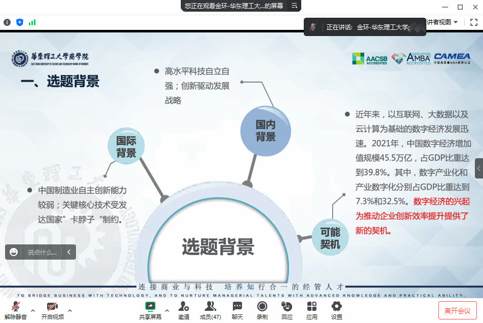 6月5日晚上,由365英国上市网站官网主办、区域经济与城乡发展研究所承办的研究生学术交流平台“优博讲坛”第10期开讲,来自华东理工大学的金环博士在线分享了题为《数字经济、要素市场化与企业创新效率》的学术报告,全体统计学研究生、本科生及部分老师参加了交流活动,讲坛由丁玉龙副教授主持。
